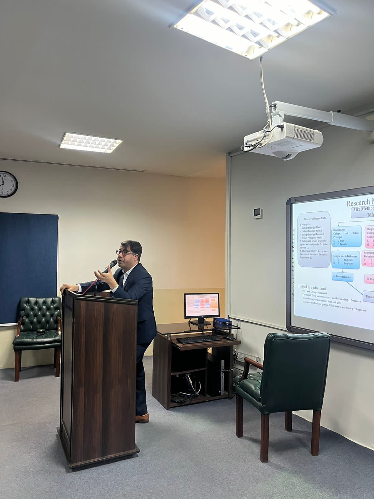 Dr. Raza Ullah in-charge Sociology Department was invited as a guest speaker at the Seminar ” Gender Reverse Change in Education in Pakistani Society,” organized by the Department of Humanities and Social Sciences, Bahria University. Dr. Raza Ullah explained gender reverse change in education in Pakistani Society. He explained the gender gap in education from the perspective of biological theories and feminist scholarships circulated in Sociology of Education. He concluded his talk by asserting that girls who were once underperformers are now outpacing boys in education at all levels.