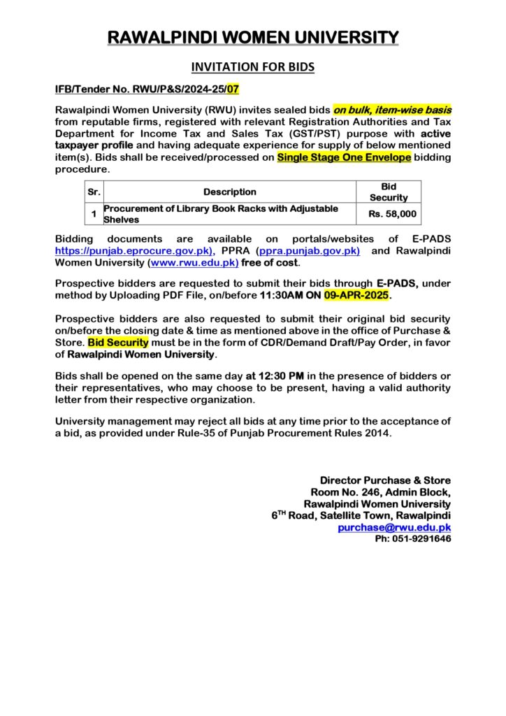 Procurement of Library Book Racks with Adjustable Shelves Tender Notice – Procurement of Library Book Racks with Adjustable ShelvesDownload Rawalpindi Women University signed an MoU with Cities for Children to foster youth engagement and volunteerism Supply and Installation of Air Conditioners Related Posts Quality Enhancement Cell Standings October 21, 2025 2,385 views Dr. Banzeer Ahsan Abbasi of Rawalpindi Women University Recognized Among World’s Top 2% Scientists September 24, 2025 1,139 views Tender Procurement of Food & Catering Services September 18, 2025 2,368 views Tender Procurement of Stationery Items September 18, 2025 2,734 views Chief Minister Punjab Wildlife Scholarship Program 2025 April 16, 2025 2,190 views
